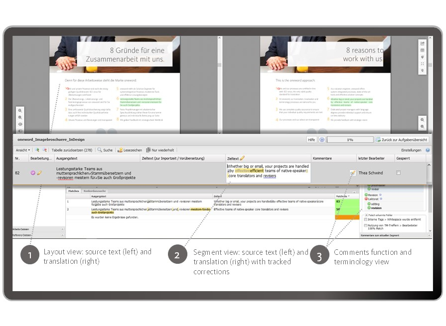 At oneword, we have developed the oneReview platform for the day-to-day process of country reviews and translation checks. Its centrepiece is the layout preview, which shows you exactly what you will see later in the finished document. Instead of abstract text fragments, you see the complete brochure, website or manual. Clicking on a position in the layout opens the corresponding text segment for editing, just like in a CAT tool. All changes are visible in real time in the preview and can be tracked by visual highlighting. Text and image content can also be commented on freely, for example if a comment relates to the replacement of an address or a layout correction. oneReview supports all common file formats, such as XML, InDesign, FrameMaker, HTML and MS Office. The review platform combines the convenience of the familiar PDF view with the functions of a translation tool. Reviewers can access stored terminology, search the TM, receive a message if a corrected segment is repeated in the document and use extensive QA functions. All changes are also integrated directly into the translation memory, where they are saved for future projects.